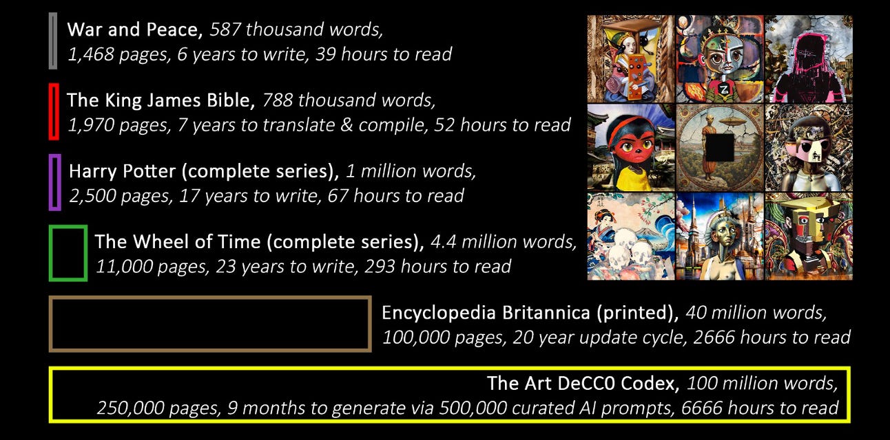 Thanks to Comput3AI‘s snappy text inference services, I was able to generate more than 800 MB of structured data via 260,000+ API calls over the course of about 2.5 days: the result is The Codex, all 105,561,738 words of it (more than 2.5 times the size of the old print editions of Encyclopedia Britannica), from which we programmatically derive the ElizaOS agent profiles and build the Art DeCC0 Codex pages with all metadata, background, lore, and characterization for all to peruse and use.