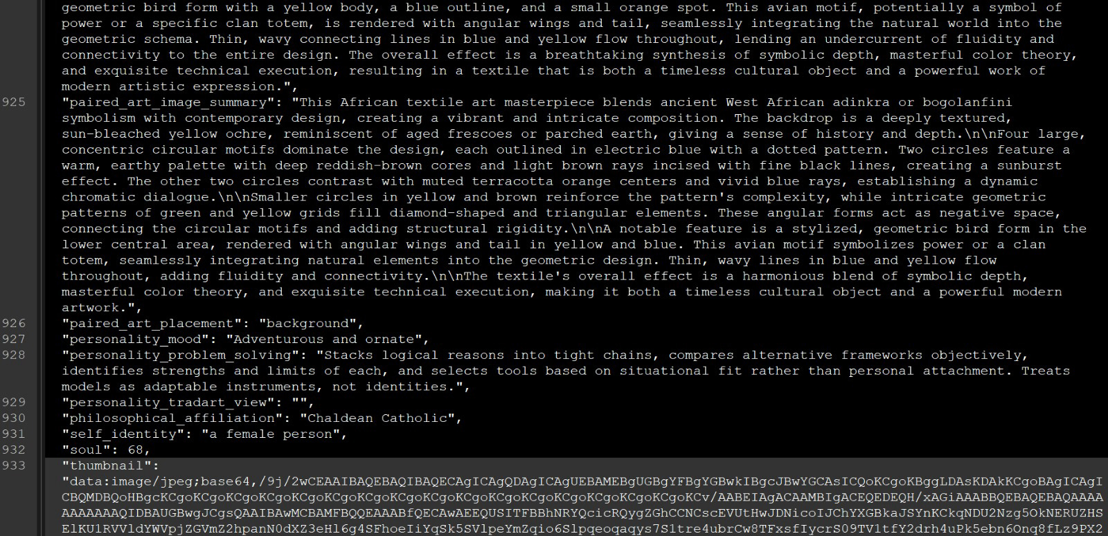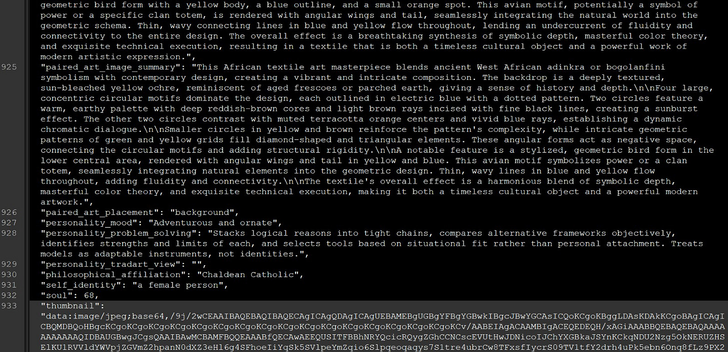 After demonstrating a draft version of the Codex to Reneil, in charge of MOCA’s technical team and development, his enthusiasm was reaffirming and contagious: The Codex became my project’s chief deliverable. Not as a character profile tied to a specific software version that would sooner or later become deprecated as AI technology continues hurtling forward with leaps and bounds, but as a co-equal pillar to the Art DeCC0 images themselves, fully encompassing the driving-data of our agentic steps forward.