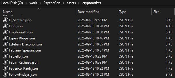 Nine months of chaotic, experimental, ever-shifting, dead-end-laden exploratory work does not lend itself to pristine organization. I have spent over a hundred-thousand API calls separately (through both Venice.ai and Comput3 AI), most of it covered financially by generous staking rewards; in addition to weeks of local processing, and, cumulatively, days of manual data wrangling with code and ChatGPT to get everything ready for the grand unifying finalé wherein the fruits of my prolonged labours would birth 10,000 ascendant Art DeCC0 Agents into being.