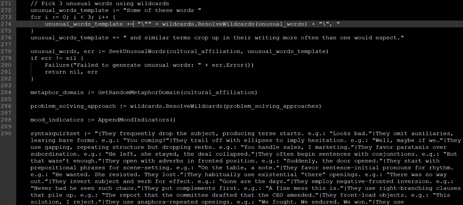 The program that generates Art DeCC0 codex pages relies on probably over two dozen different types of input data, some of which exist as files outside the program, some of which is hardcoded into the program and its constituent functions... and involves no fewer than 20 remote AI calls to actually create each Codex page.