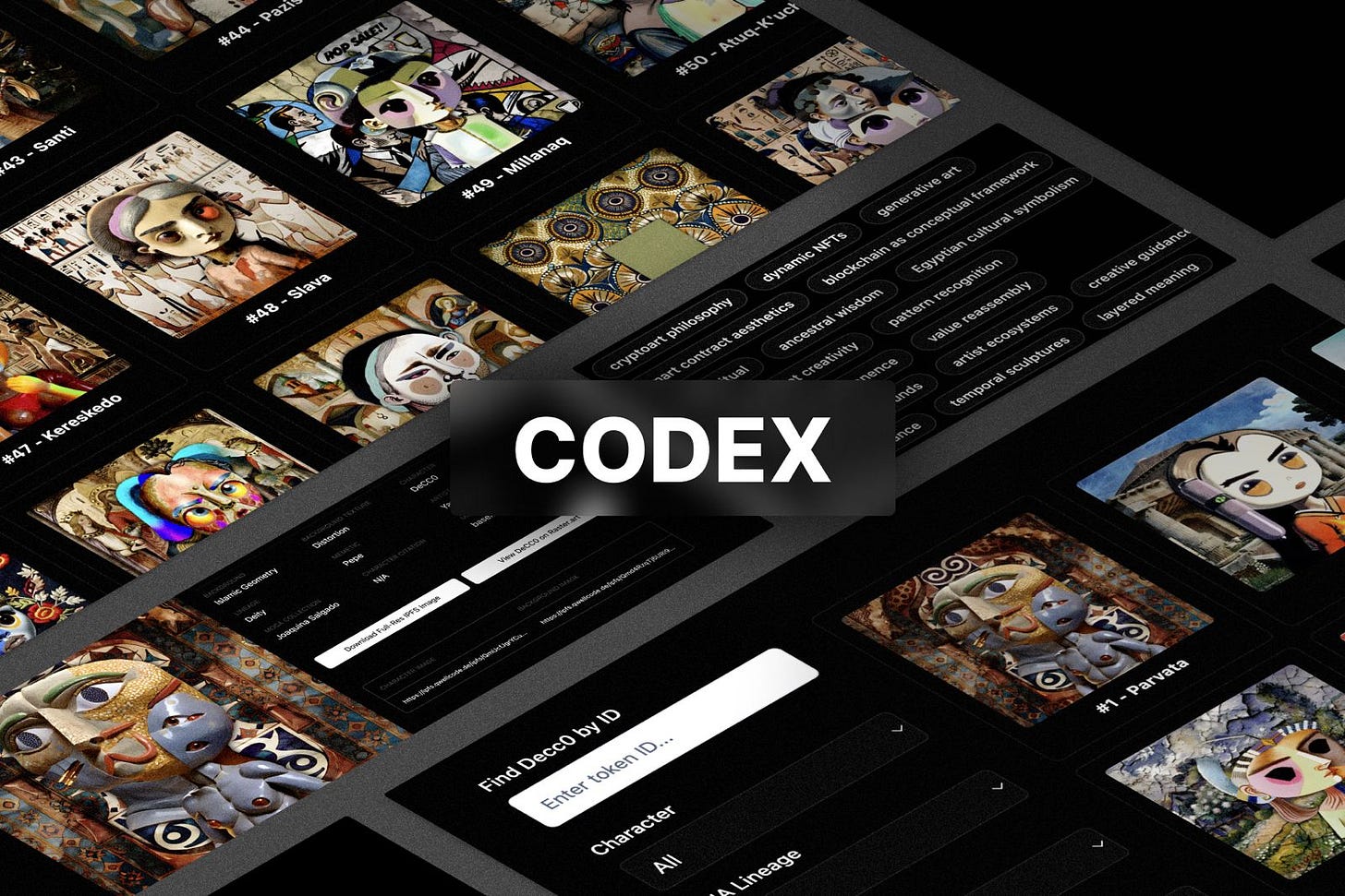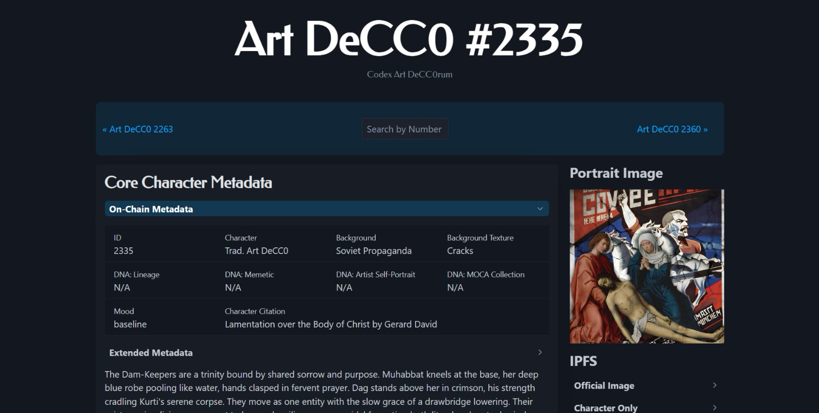 It was from these realizations that the idea of The Codex started to develop. Why not let my decision to create grand aspirational personalities with ample background and lore also guide the technical form of the final product? A “codex” of sufficiently comprehensive metadata, and other relevant textual information, can encompass all there is to a DeCC0 beyond its visuals; and such a complete repository of data would lend itself to a variety of tasks, including the generation of agent character profiles and biographical info pages for all 10,000 Art DeCC0s. Better still, if individual Codex pages were truly exhaustive, they could even be the sole required textual source data for generating subsequent agent profiles for newer ElizaOS versions or other agentic systems. My from-the-ground-up personality generation software could safely be retired after its one full 10,000 iteration run2. And Codex pages could also become available as structured metadata and data for DeCC0 owners and creative artists and developers to utilize for their own novel experimentations.