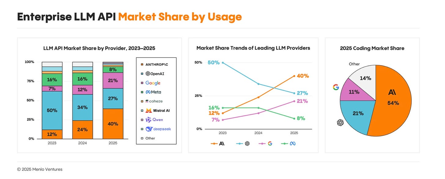 The very bold-faced fine print is that OpenAI’s leadership both didn’t understand the real scalability of AI systems and that they cared too little for safety. Amodei has been fairly consistent on this point, setting Anthropic apart from OpenAI with a fundamental and well-marketed emphasis on safety. Part of the reason Anthropic has such a stranglehold over the Enterprise AI market (as evidenced by the graph below), is Amodei’s insistence on, “[designing their flagship model Claude] with safety and controllability in mind from the beginning. A lot of our early customers have been enterprises that care a lot about, you know, making sure that the model doesn't do anything unpredictable. Or make facts up.” That last subtle jab addresses both ChatGPT and Google Gemini’s infamous tendencies even today to hallucinate incorrect answers.