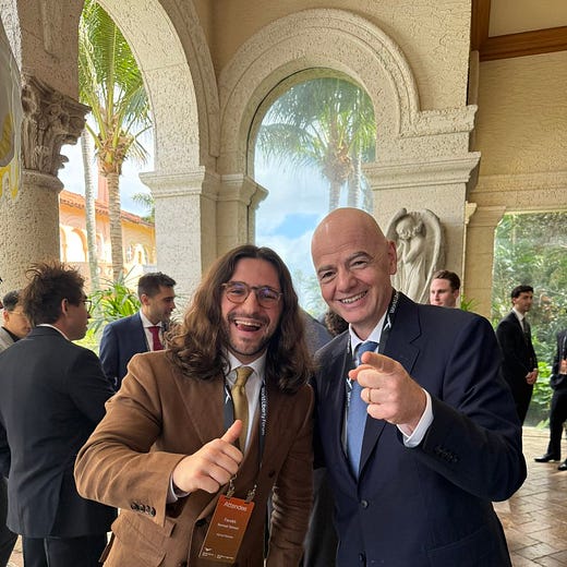 CZ’s Binance is the second largest centralized crypto index in the world, and his financial crimes are both international and many. Brian Armstrong’s Coinbase has sucked the life out of decentralized ecosystems by way of marketing, legal challenges, and product discrimination. FIFA, and specifically Gianni Infantino, is often called among the most corrupt businesses in the world. I have no ability to specifically regurgitate the claims of corruption and extraction I’ve heard charged against Farokh, but I have heard many. These people gather together along with the CEO of Goldman Sachs at a private estate owned by the President of the United States of America to direct crypto’s future. The future of crypto is now singularly in the hands of this class: walled garden, comically wealthy, well-connected, deferent not to the system but to a man.