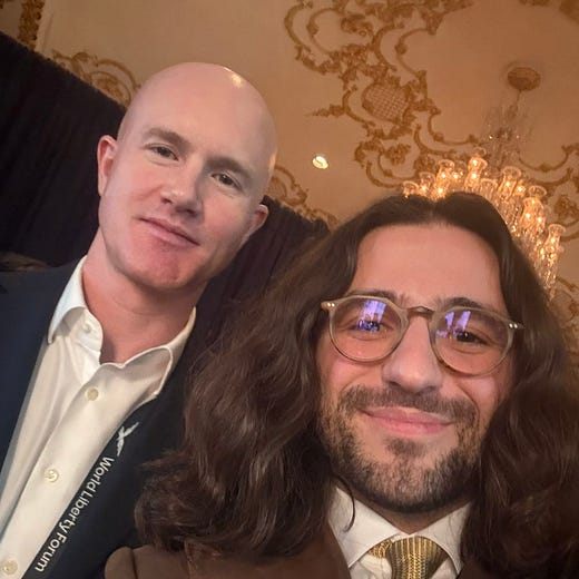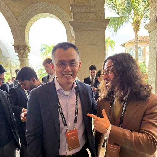 If you don’t know what you’re looking at, that would be Coinbase CEO, Brian Armstrong (top right), Binance founder CZ (bottom-left), and much-maligned FIFA CEO, Gianni Infantino, all posing with Farokh in and around President Donald Trump’s private residence, Mar-a-lago, in West Palm Beach, Florida. Sorry for all the commas. As Farokh states in the Tweet, “From the heads of Goldman Sachs, NASDAQ, the CFTC and more, to Binance and Coinbase, the room was packed.” He then goes on to thank Zak Folkman, Zach Witkoff, and Chase Herro —the COO, CEO, and CSO of the extremely Trump-aligned World Liberty Financial— for hosting the event, which was also sponsored by the President’s two sons, Eric and Donald Jr.